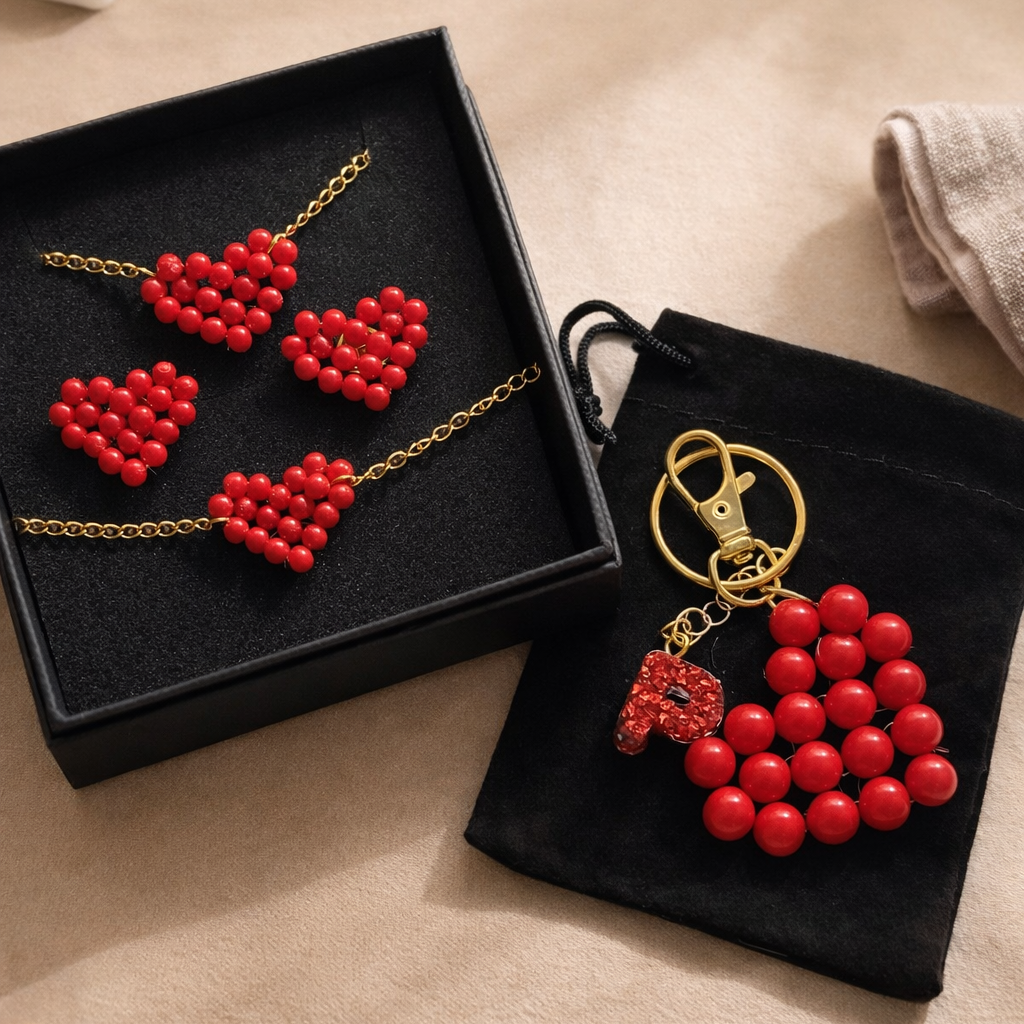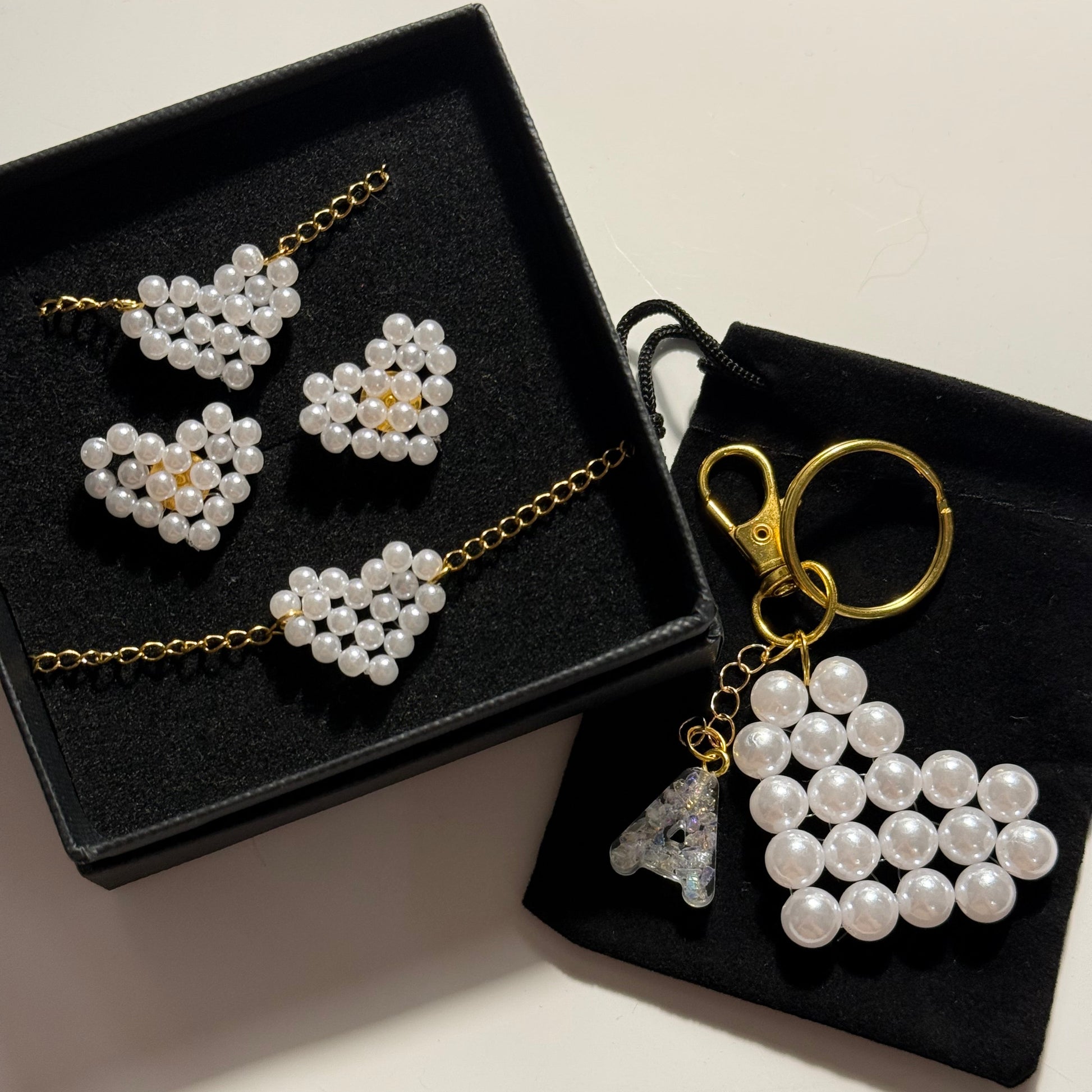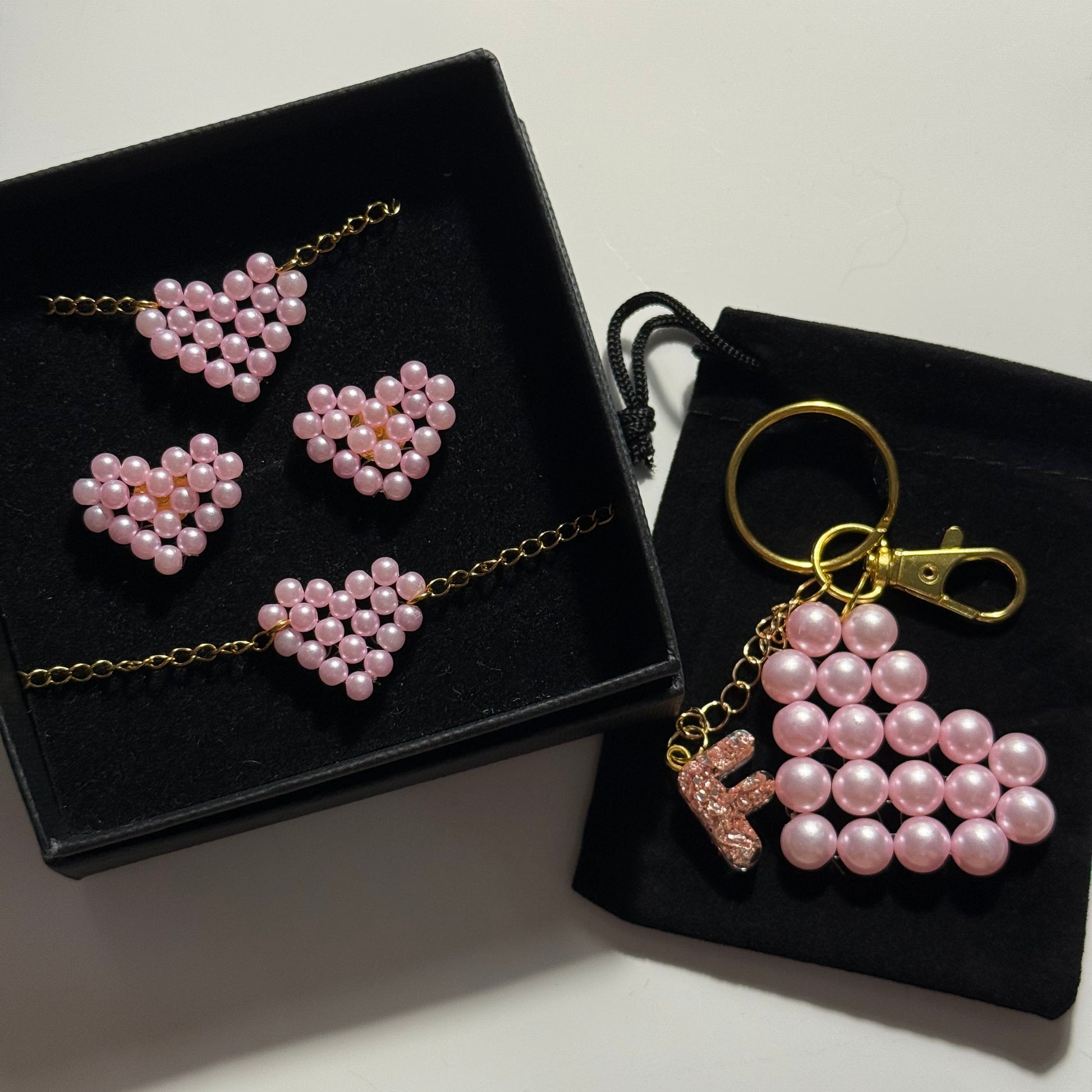 A szett tartalmaz egy gyöngyös szívecske ékszer kollekciót és egy hozzá illő kulcstartót, személyre szabva, így tökéletes ajándék szeretteidnek – vagy saját magadnak.